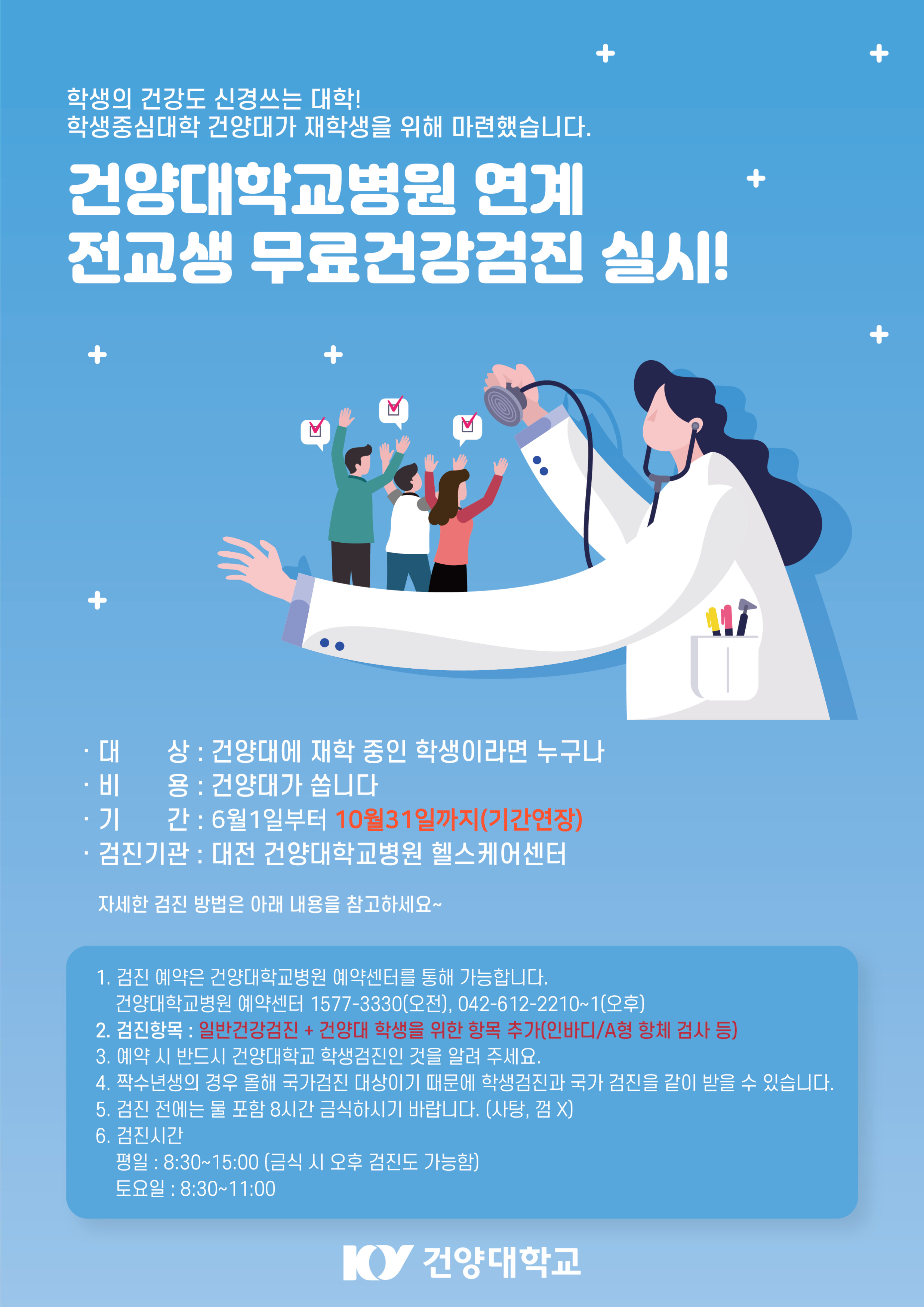 | 제목 | 건양대학교 전교생 무료 건강검진 실시안내(기간연장) | ||||