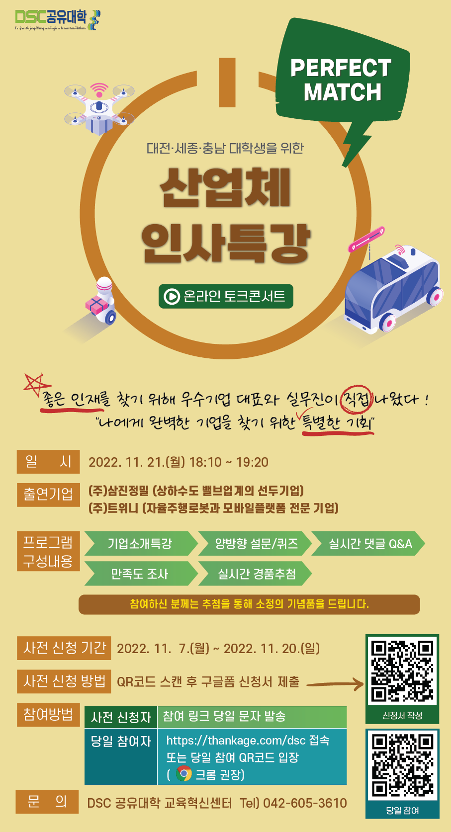 | 제목 | [DSC 공유대학] 대전·세종·충남 대학생을 위한 산업체 인사특강(3차) : Perfect Match 온라인 토크 콘서트 | ||||