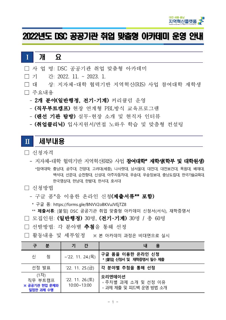 | 제목 | 2022년도 DSC 공공기관 취업 맞춤형 아카데미 참여자 모집 | ||||